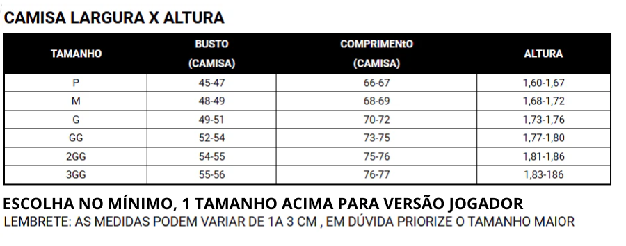 As camisas Torcedor e Jogador possuem diferenças importantes de modelagem, tecido e tecnologia.